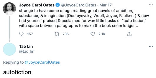 Hopefully Twitter won’t exist by the time I’m 82, though if it does, I hope I use it like Joyce Carol Oates. When she’s not posting horrific pictures of her infected foot, she’s disregarding a whole era of novels as “wan little husks of ‘auto fiction’ with space between paragraphs to make the book seem longer”.